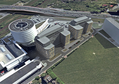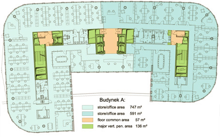 The idea behind the shape of the buildings is to case rectangular courtyards opening towards the West with a light glass form. The soft line of outer elevations, underscored by the inter-window sandstone bands forms a smooth frontage arch of Daimlera Street, corresponding to the neighboring Mercedes building. The retired elevation front of the upper floors as well as the ground floor, further brought to attention by aluminium posts, lends further lightness to the building. A solicitous selection of fit-out materials underlines the prestigious air of the building.